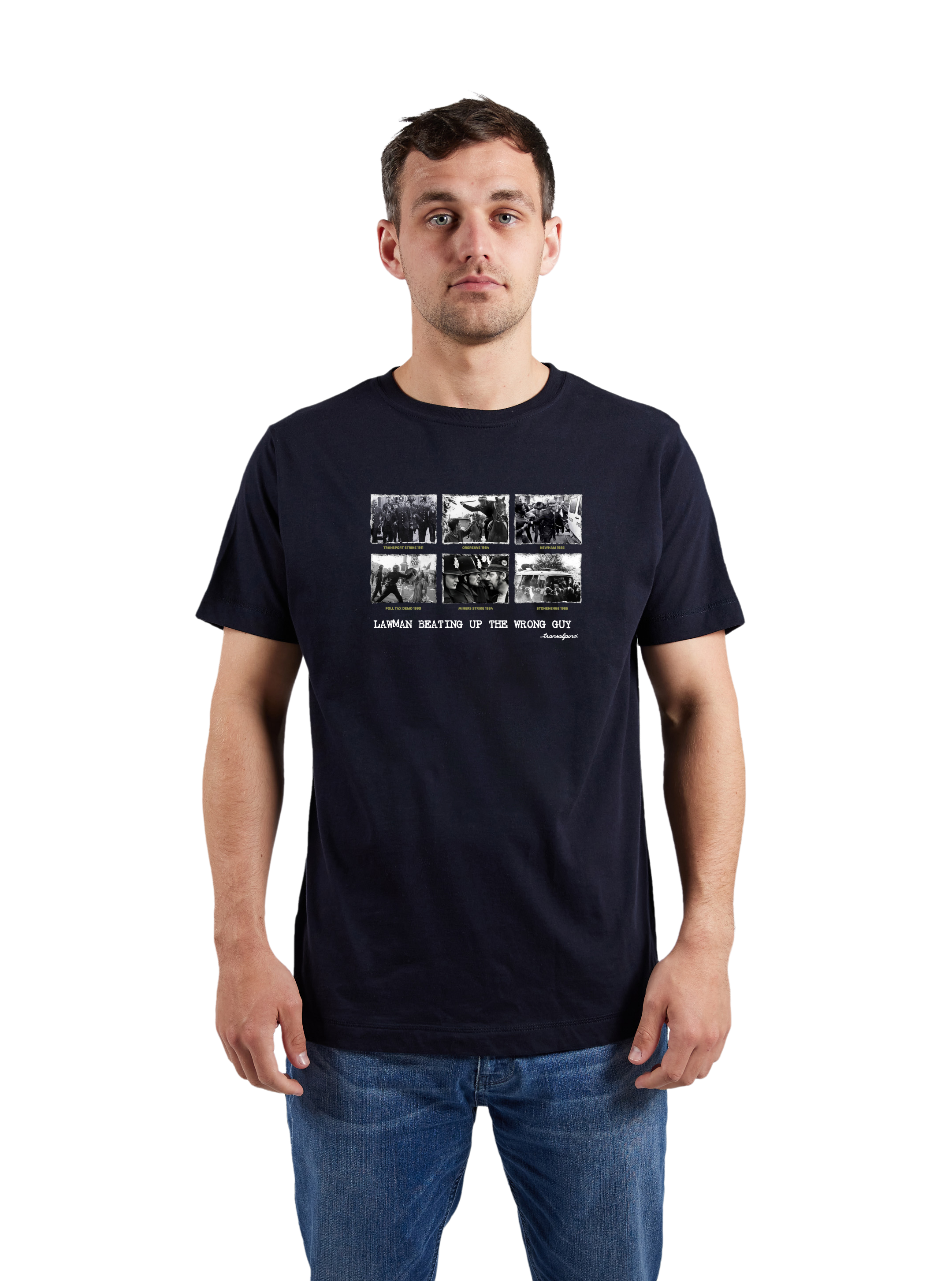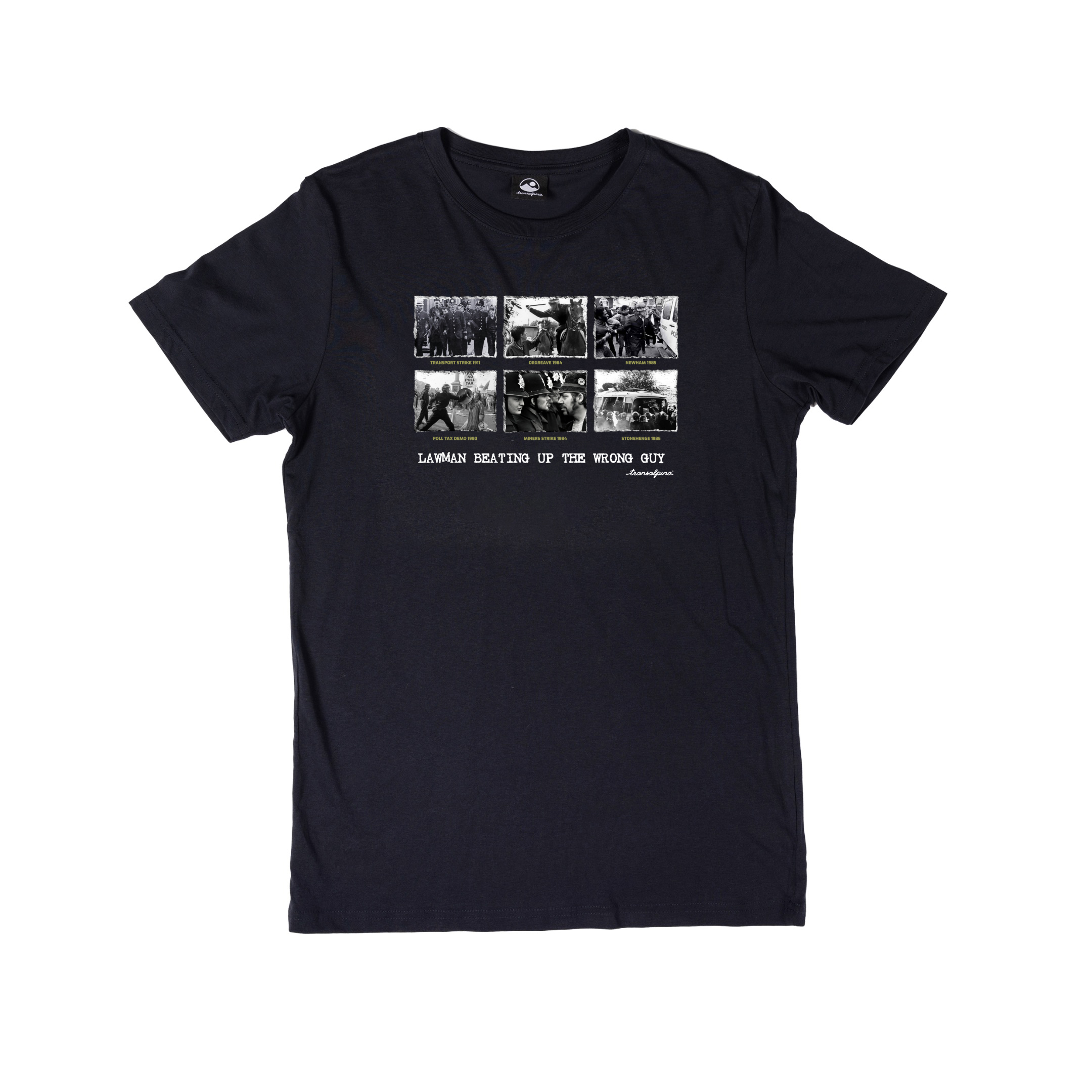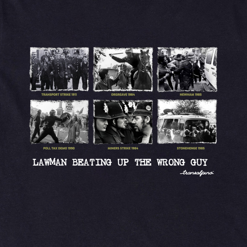The history of working-class struggle against the police stems from the perception that police forces were created and are primarily used to protect the interests of the ruling class and control the working population. This design uses a number of memorable confrontations in history with one of our favourite lines from David Bowies Life On Mars thrown in.
