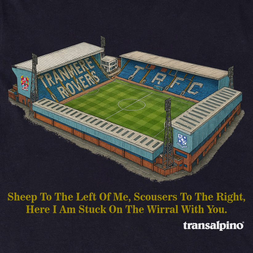 Inspired by a cracking flag often seen sported by Tranmere Rovers fans, this beautifully illustrated image of Prenton Park, is accompanied by a rift on Stealers Wheel's cult anthem 'Stuck In The Middle'.