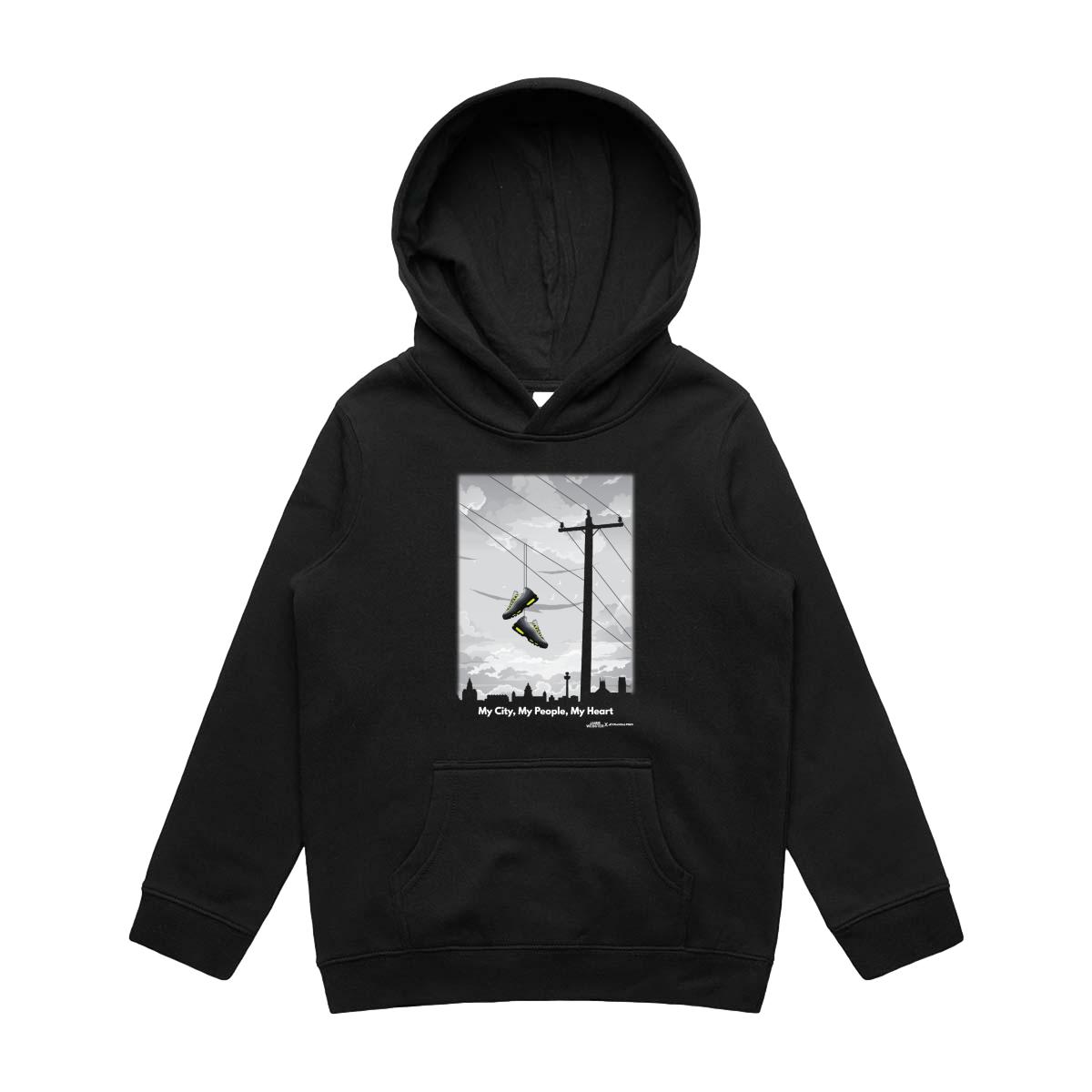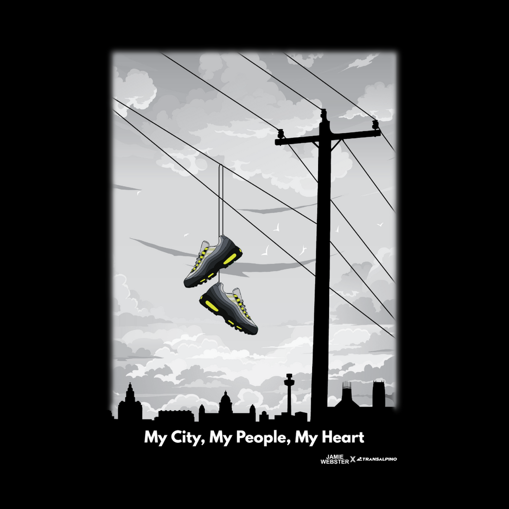 Another from our collaboration with Jamie Webster inspired from the album cover from 'We Get by' that the blinding single This Place comes from and reworked to feature the Liverpool skyline and Jamie's trademark footwear.