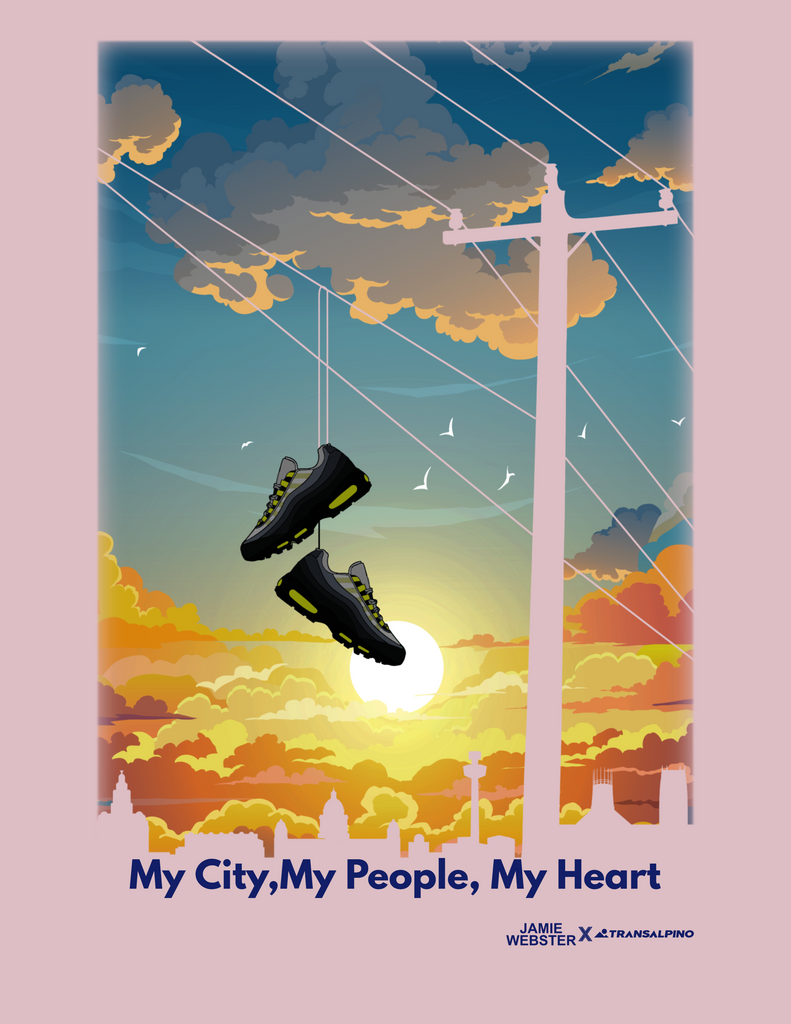 Another from our collaboration with Jamie Webster inspired from the album cover from 'We Get by' that the blinding single This Place comes from and reworked to feature the Liverpool skyline and Jamie's trademark footwear.